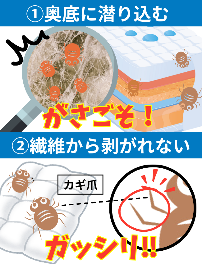 出典:環境再生保全機構 ERCA「ダニの隠れ場所を突き止めろ!(ダニ対策の実践3/6)」(https://www.youtube.com/watchv=ypqSdNYbTTg&list=PLsTu8kSbe2FC1ImPf08ObZzh_9veivYd8&index=3)を加工して作成